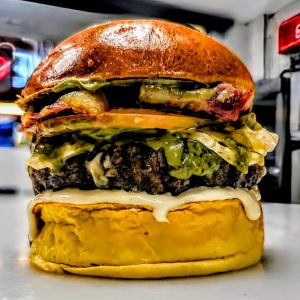 Pan de brioche, patty de ternera 180gr. Black Angus, queso Brie flambeado, rodajas de tomate natural, doble de Bacon Ahumado, salsa Trufada y crema de Pistacho Ibérico
